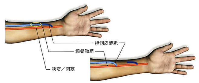 どのようになおすかはシャントの閉塞の原因、シャントの状態、残った動静脈の状態によって変わってきます。自己血管内シャントの閉塞の原因としては、動脈と静脈の吻合部が狭くなったり、頻回の穿刺によって静脈が狭くなることが一般的です。前腕にまだよい静脈が残っていれば、より上の場所で吻合し、シャントを作りなおします。適切な静脈が無ければ人工血管を使って新しいシャントを作ります。